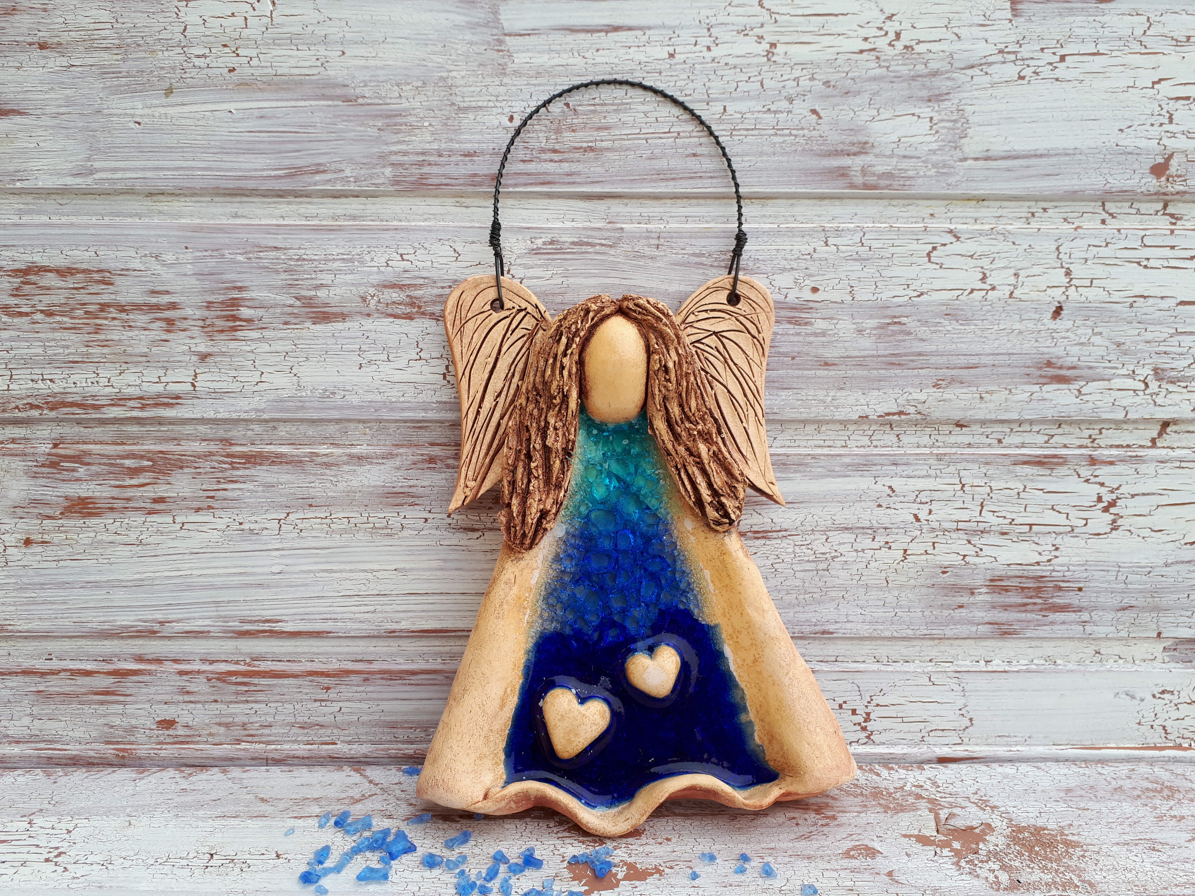 Keramická andělka v přírodním stylu s patinou, dozdobená sklem a glazurou.