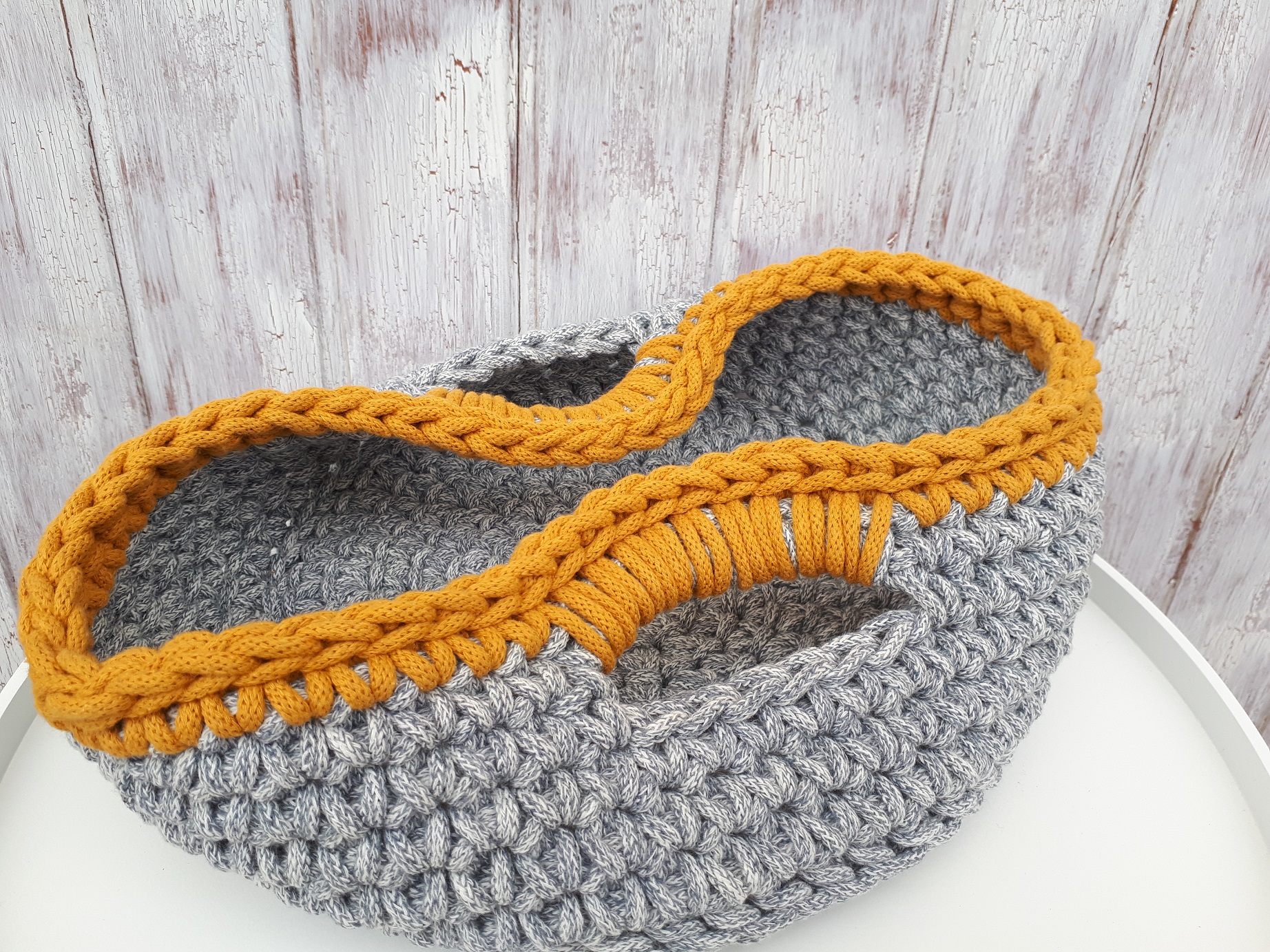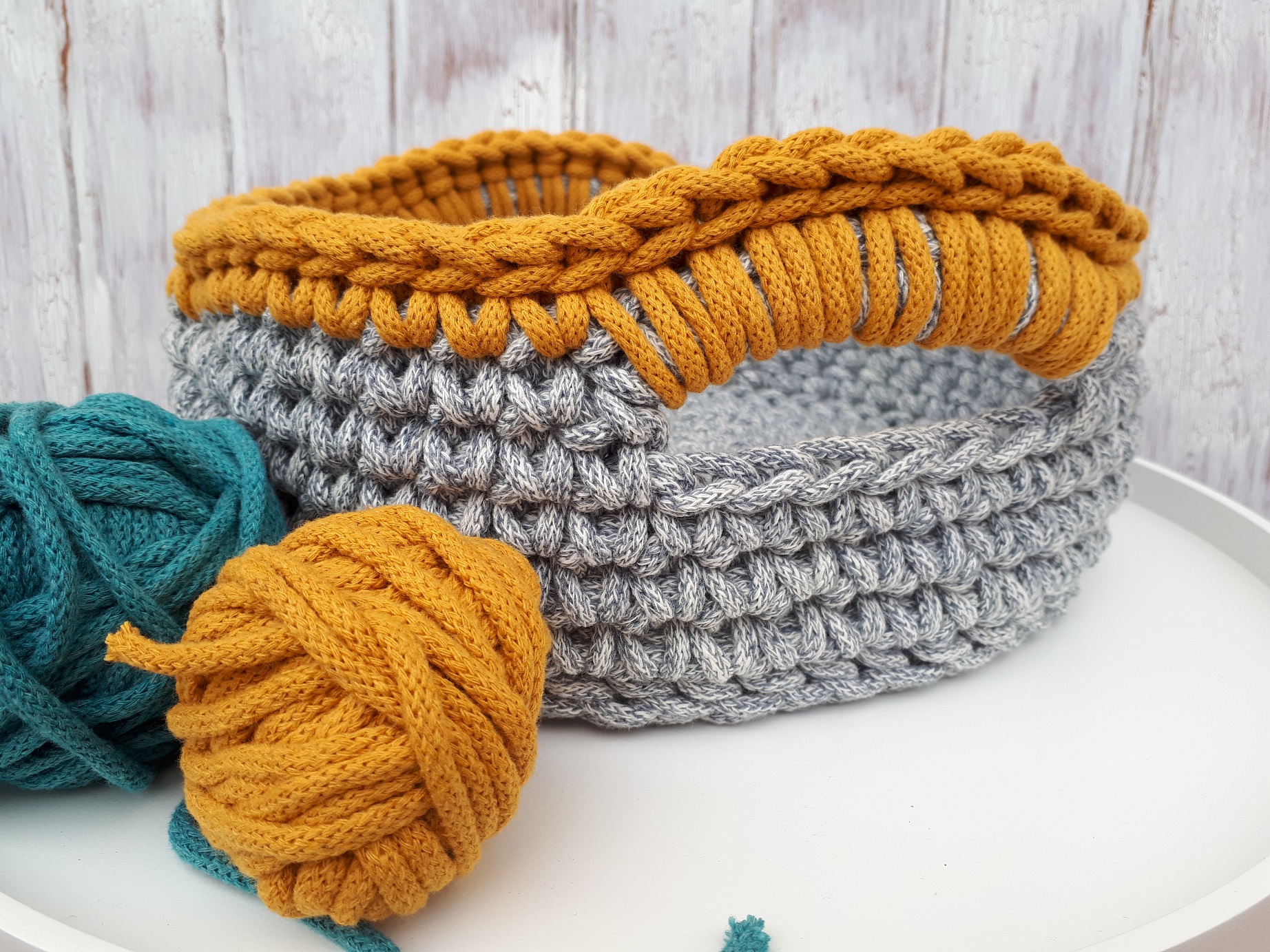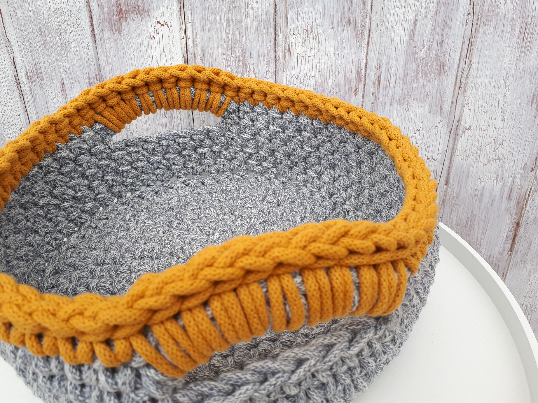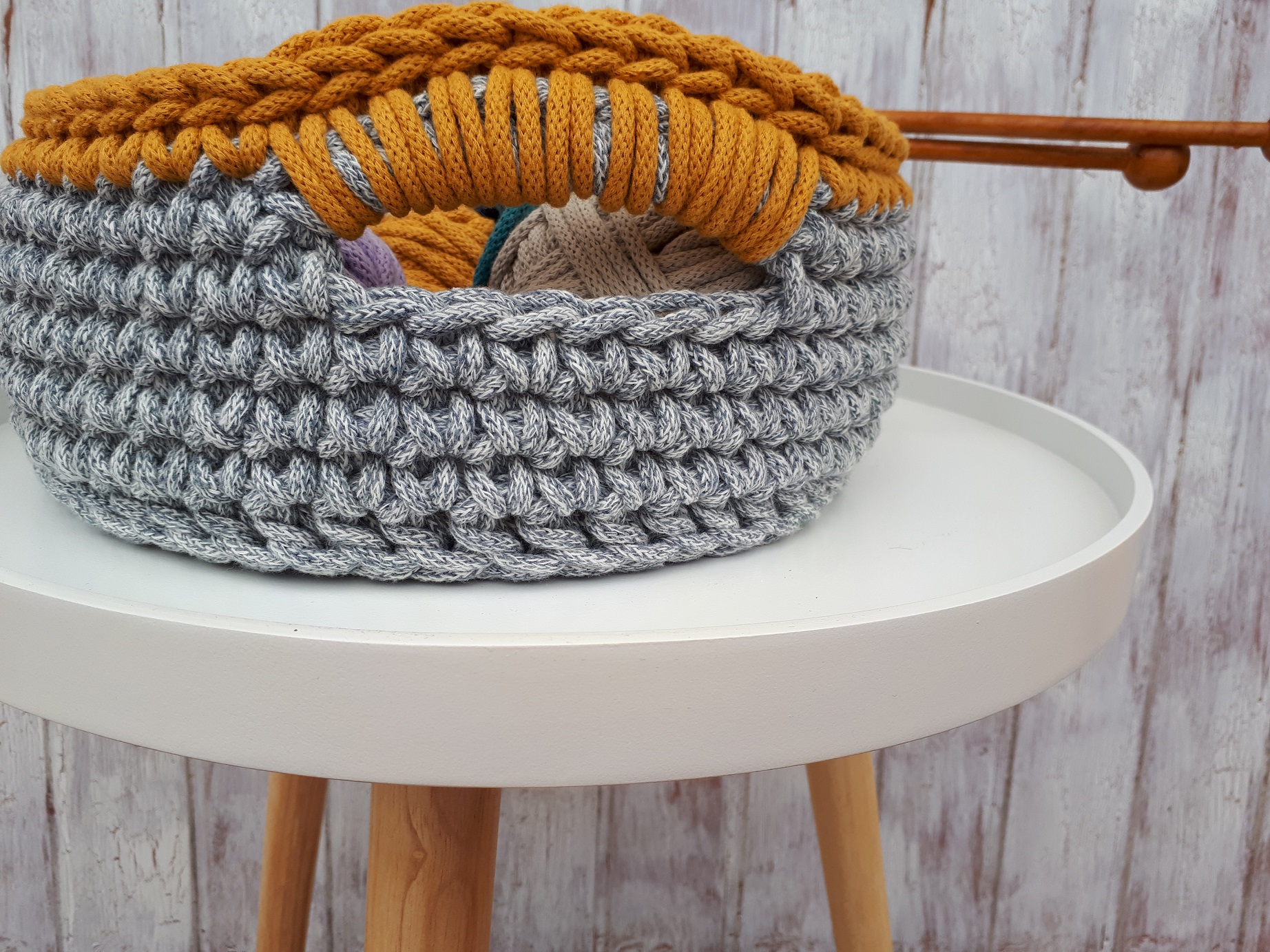 Bavlněná ošatka je háčkovaná z bavlněných šnůr.