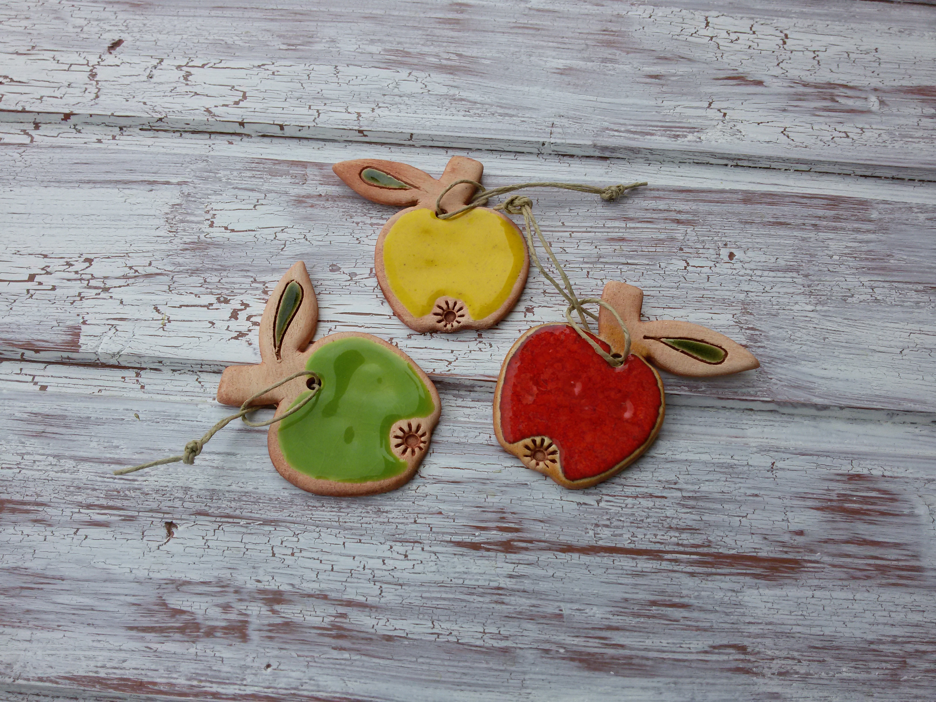 Keramická, celoglazovaná jablíčka na pověšení.