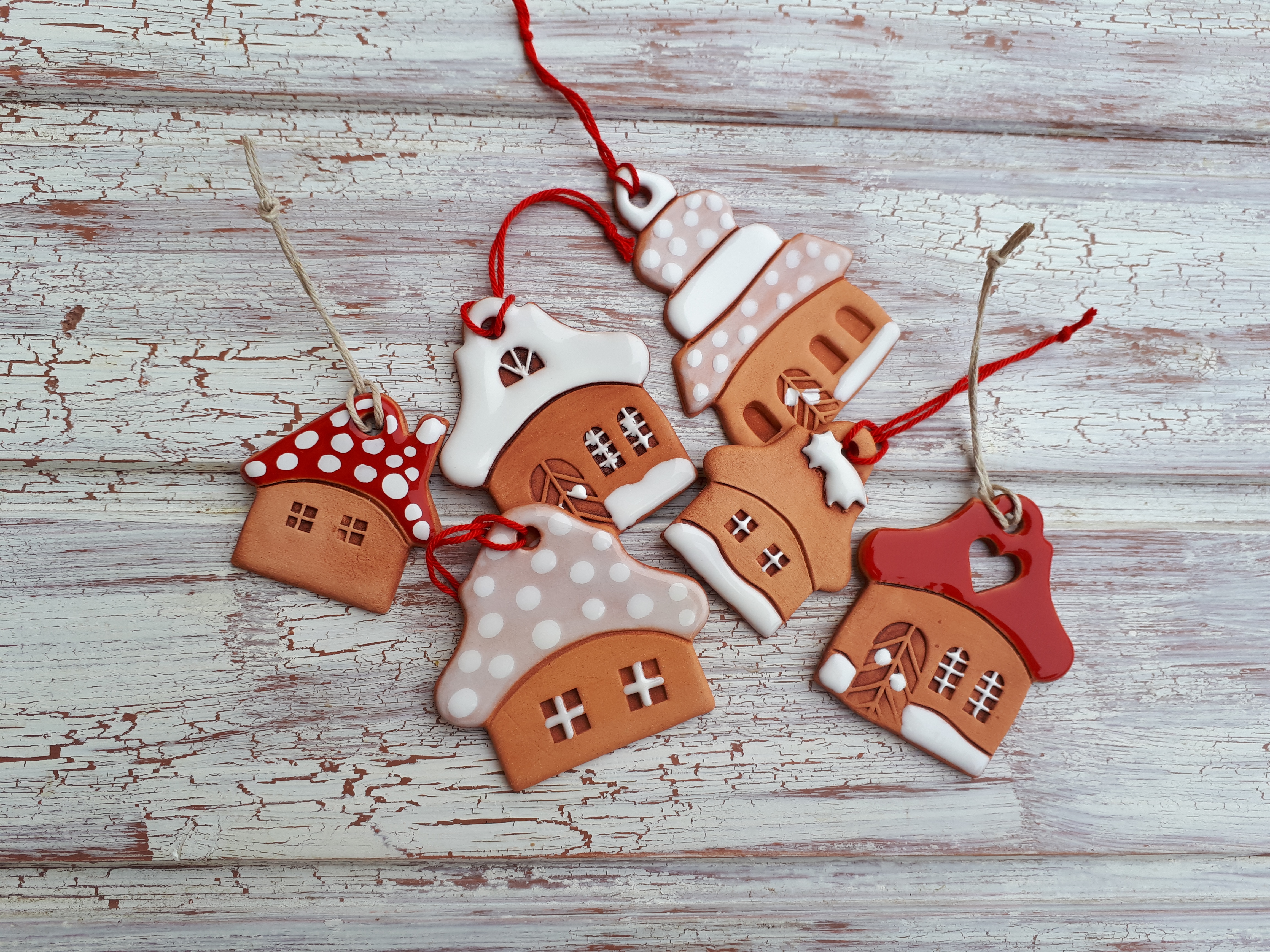Keramické vánoční chaloupky v přírodním stylu zdobené glazurou.