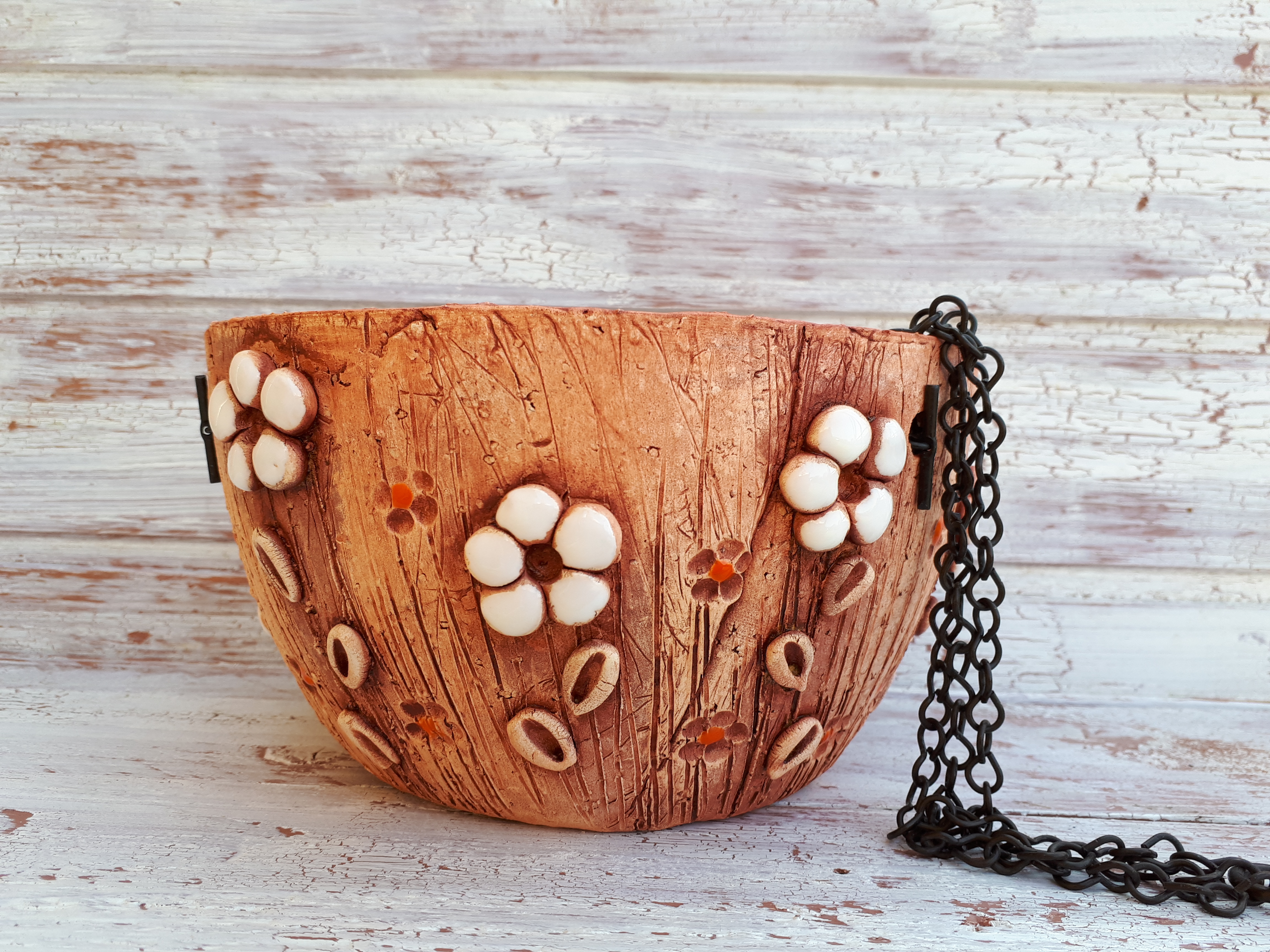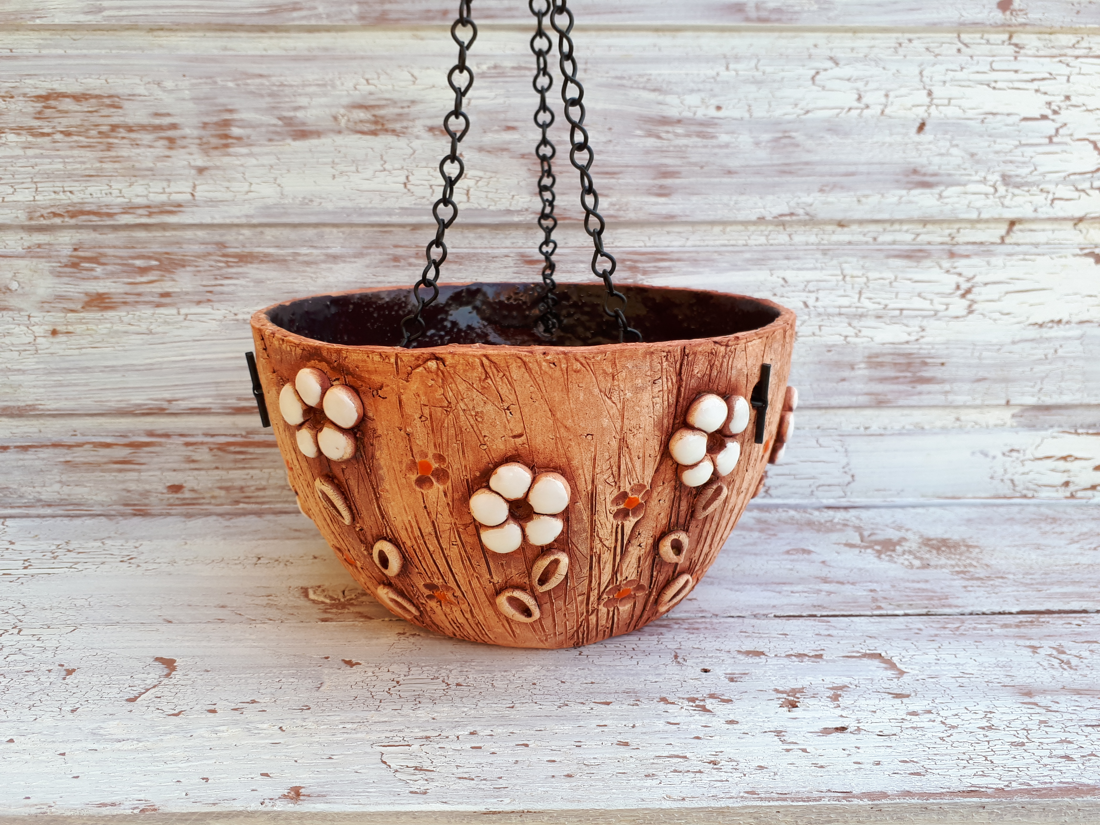 Keramický závěsný květináč v přírodním stylu dozdobený glazurou.