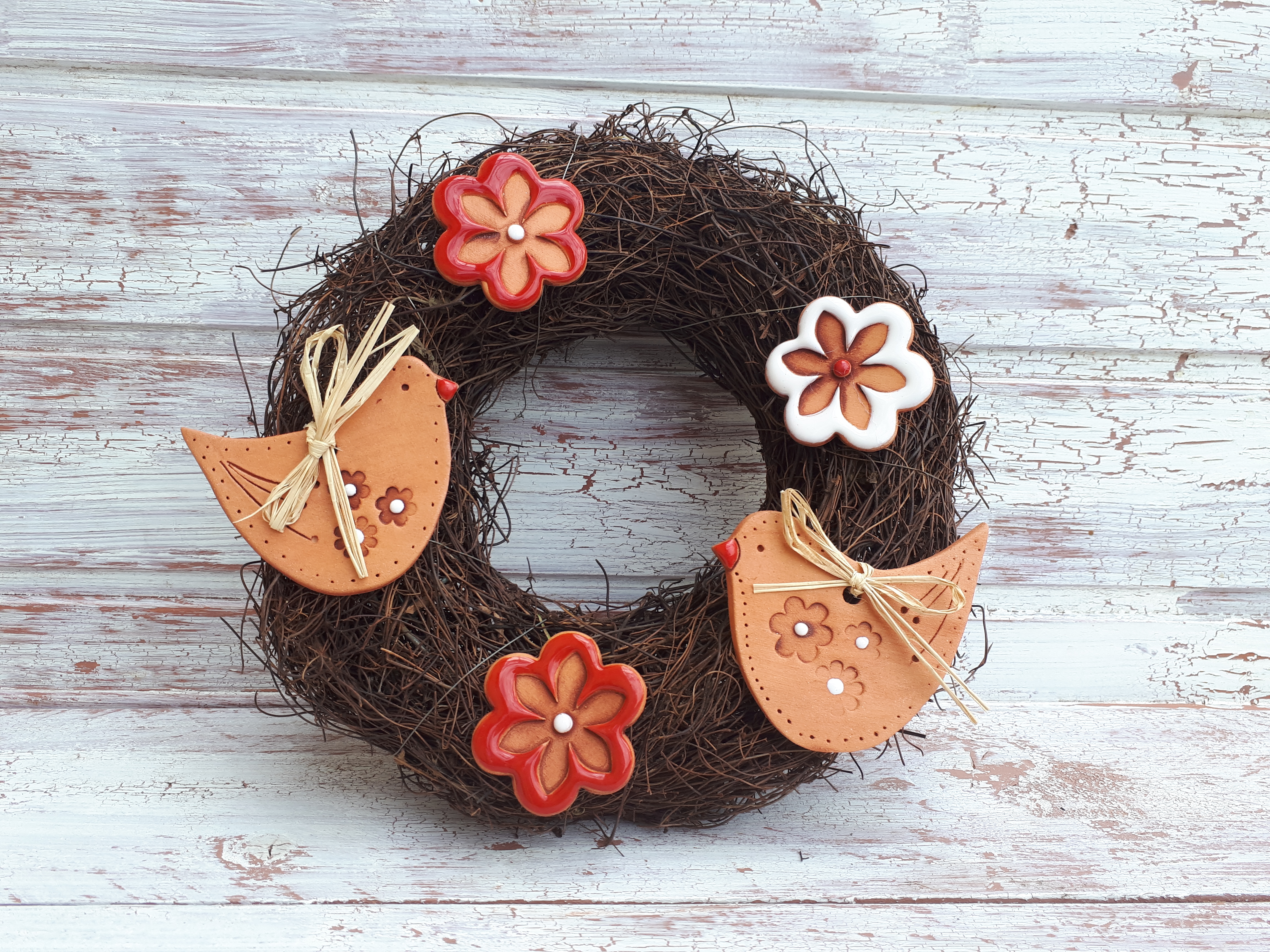 Proutěný věneček, zdobený keramickými komponenty, přírodniny.