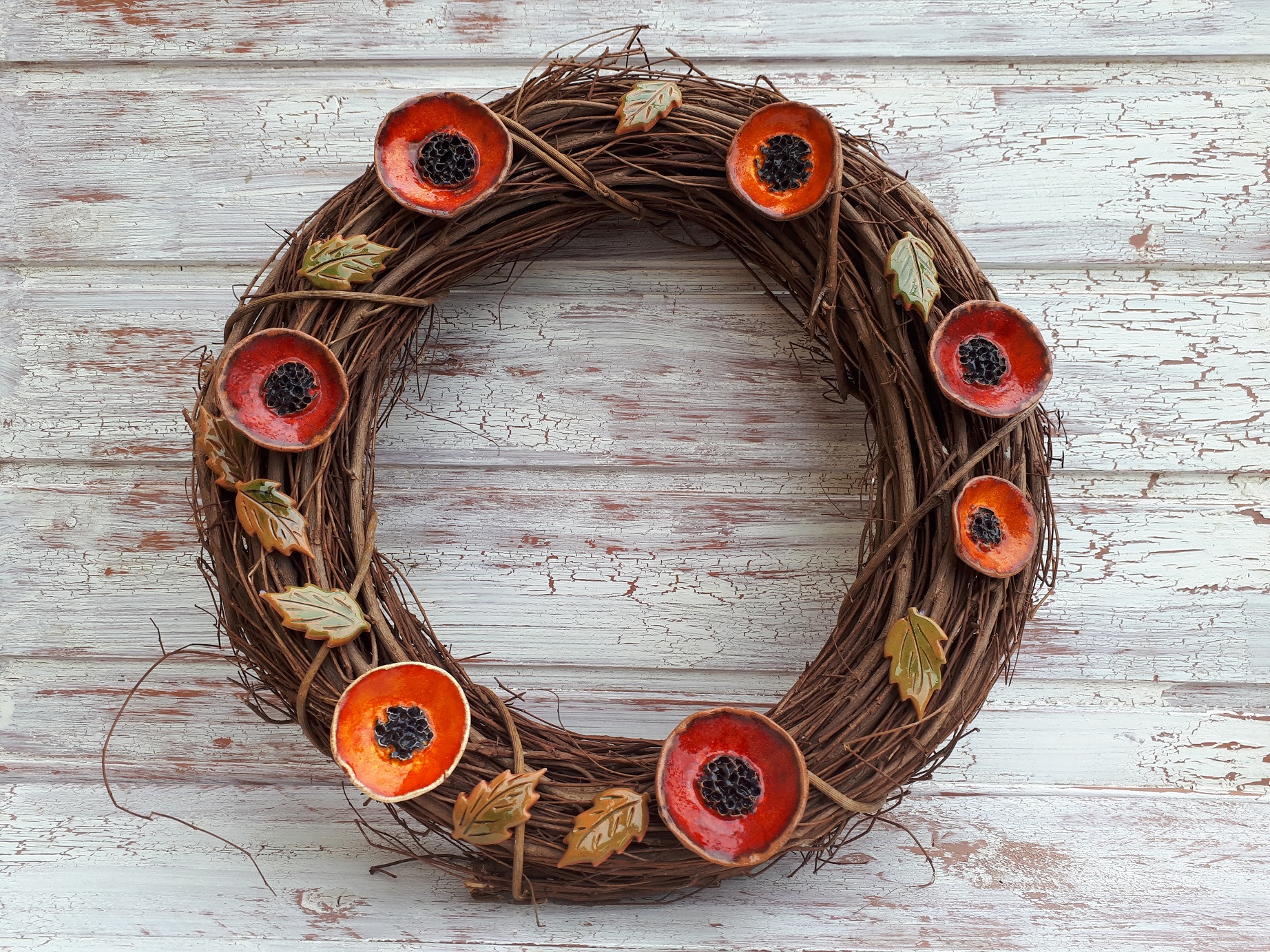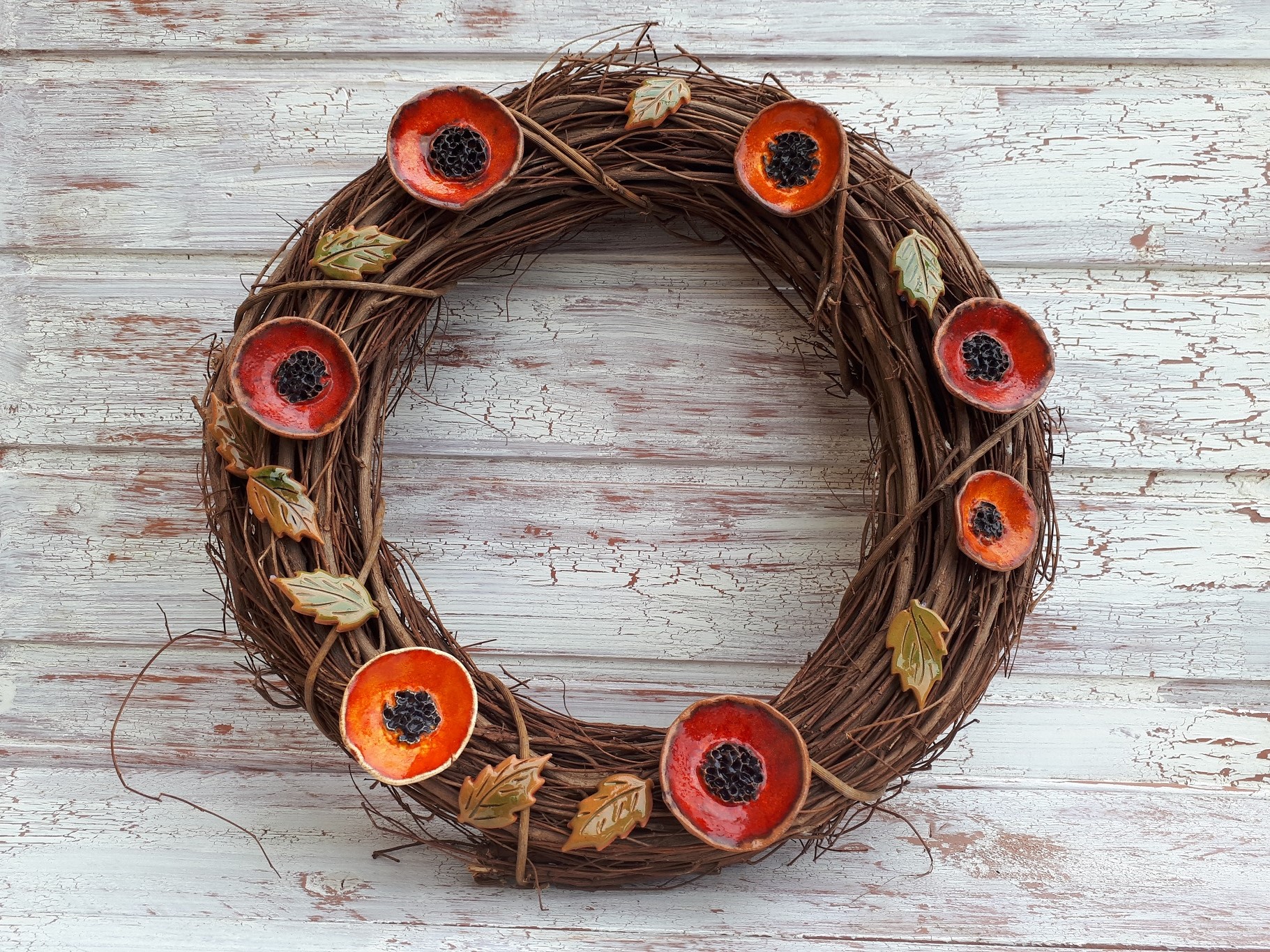 Dekorarace v přírodním stylu. Věneček proutěný zdobený keramikou.